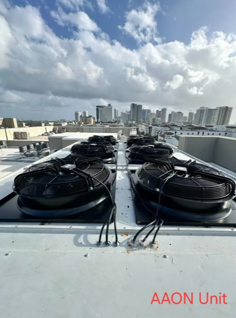 Condenser fan motors, VFD drives, pressure transducers, coils, and control components in one place.