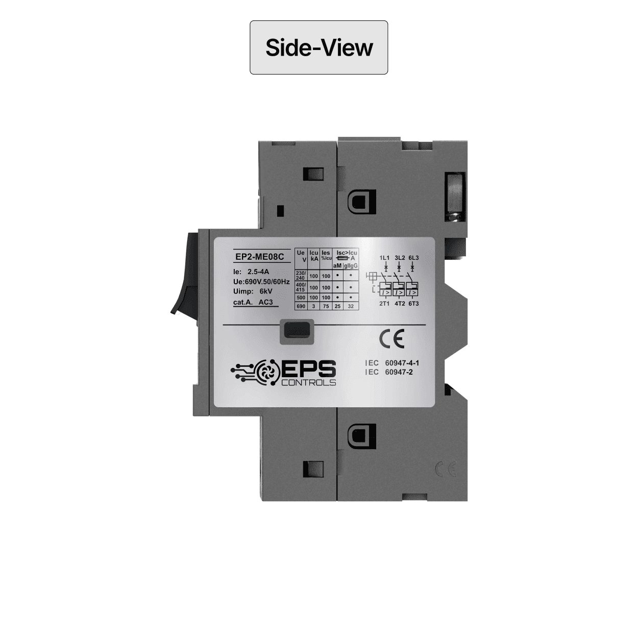 The EP2ME08C is a compact thermal-magnetic motor protection circuit breaker designed for reliable overload, short-circuit, and phase-failure protection for motors in the 2.5–4A range. With integrated STOP/START pushbuttons, adjustable thermal release, and true Type-C magnetic protection, it delivers robust performance in a small footprint. Fully compliant with IEC 60947-2 and IEC 60947-4-1, it is ideal for direct-on-line motor control, HVAC equipment, pumps, fans, and automation panels.